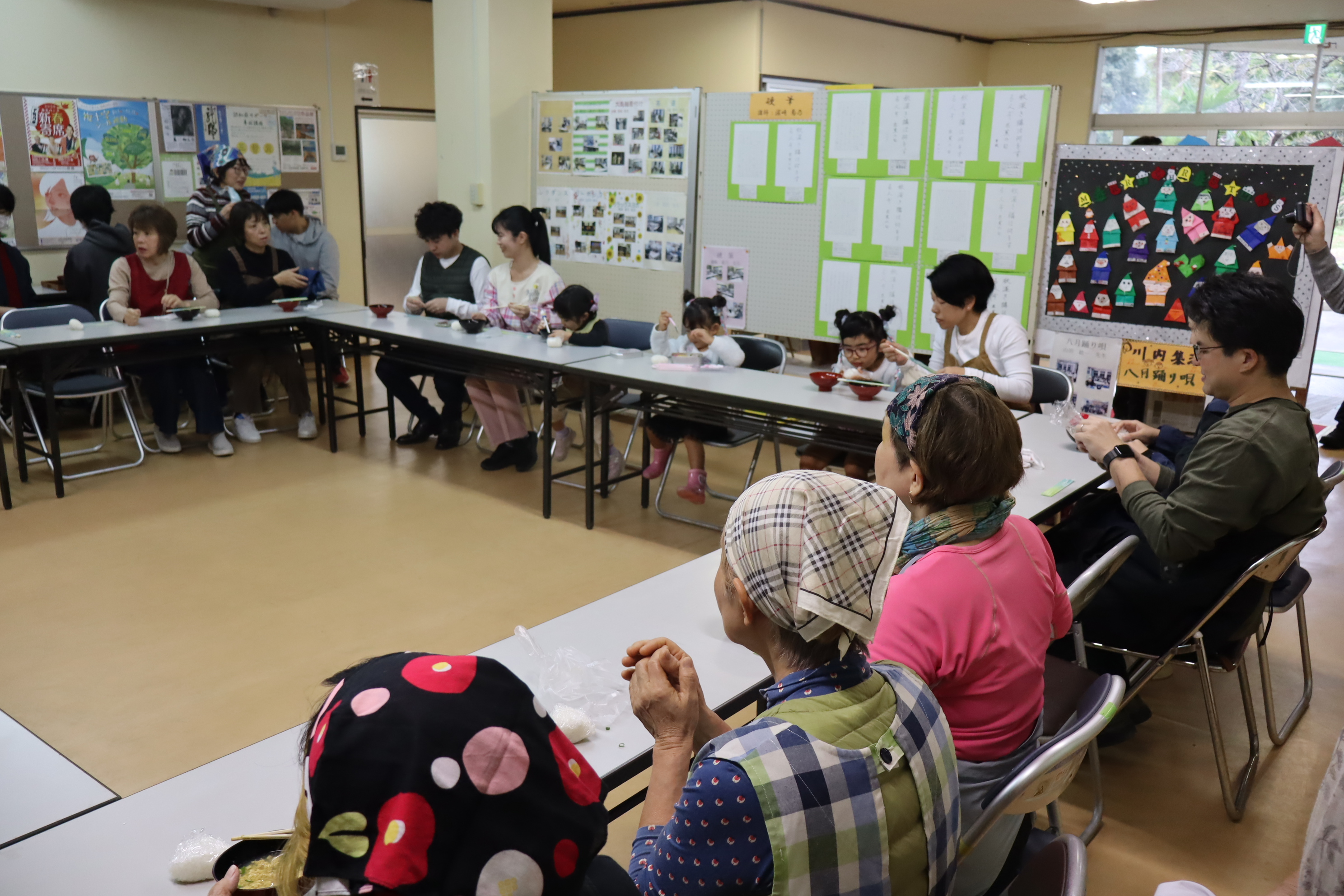午前中、住用川流域で捕れるモクズガニを使った郷土料理「フヤフヤ汁」の料理体験会を西仲間石原老人クラブの皆さんの協力で開催しました。予想を超える21人の参加がありましたが、住用でも見る機会が少ない料理なのか、地元の方や大学生など多くの見学者もきていました。参加者は老人クラブの指導で教わりながら作り、出来上がったフヤフヤ汁を皆さんでおいしくいただきました。